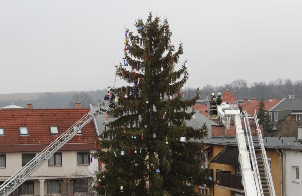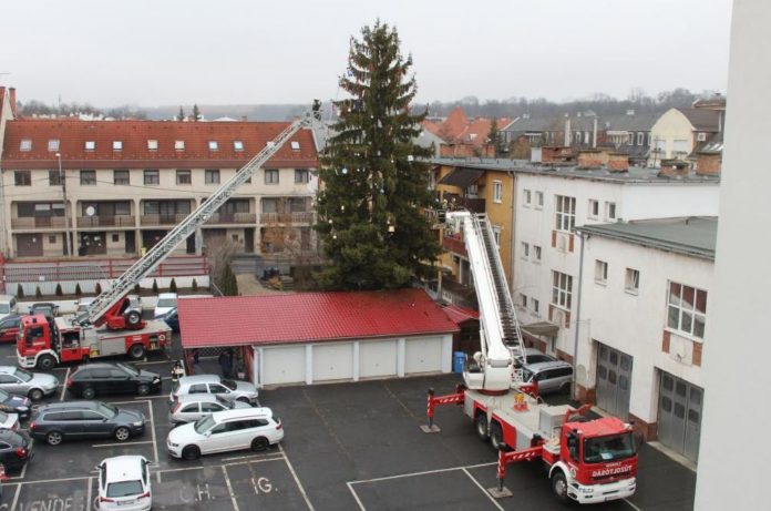 Der große Weihnachtsbaum an der Kaserne in Miskolc ist in jedem Jahr ein großes Gemeinschaftsprojekt. So auch in diesem Jahr. Sämtliche Kindergärten und Schulen haben wochenlang die Weihnachtsdeko für den Baum gebastelt, die dann gestern von der Feuerwehr mühevoll auf den Baum gehangen wurde. Gleich mit zwei Drehleitern waren die Einsatzkräfte mit dem Schmücken beschäftigt. Neben der tatkräftigen Bastelarbeit der Kinder steht auch die Unterstützung der Elektrofachgeschäfte vor Ort, die sich um die Beleuchtung des Baumes gekümmert haben.