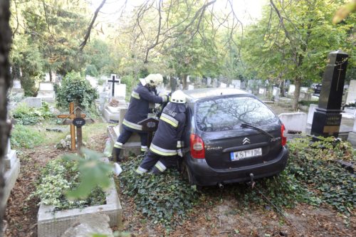 Megcsúszott a Farkasréti temető melletti meredek úton, átszakította a temető kerítését, és a sírok között állt meg, az a jármű, amelyet a tegnapi nap folyamán szabadítottak ki tűzoltók. A gépkocsi bár több sírt megrongált, személyi sérülés nem történt.