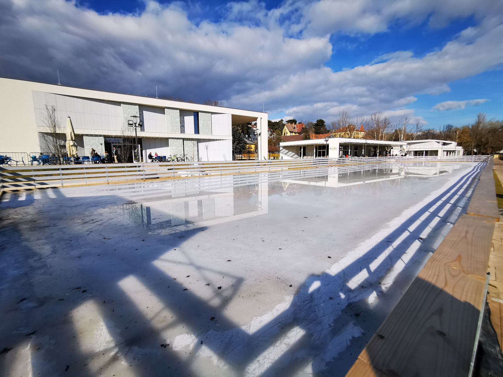 Derzeit ist sogar noch eine Eisbahn vorhanden, die man hier in den Wintermonaten installiert hatte. Bei heutigen 15 Grad und strahlendem Sonnenschein schmilzt jedoch die Eisfläche so langsam dahin. Witzig sieht es trotzdem aus, wenn am Rande die Touristen mit Sonnenbrille und Eis essend am Schlittschuhrondell vorbeiziehen. So bereitet sich Balatonfüred nun auch langsam auf die Schönwetterzeit vor.