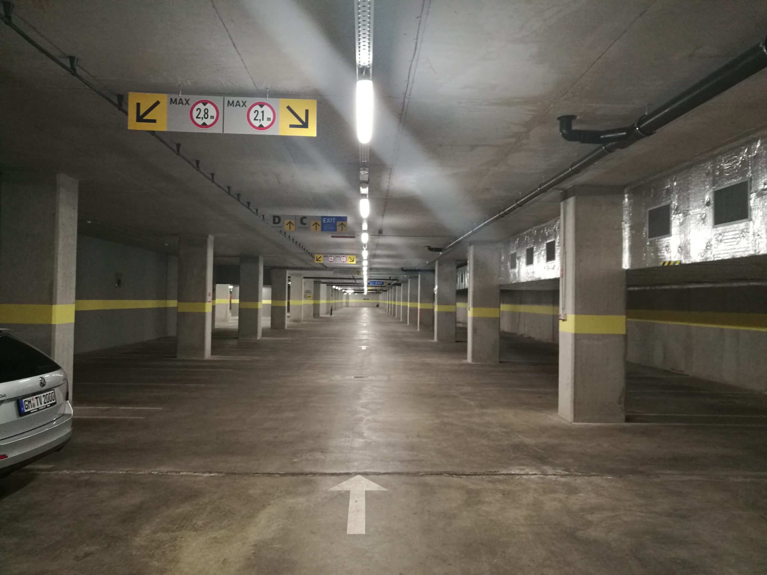 Der Parkautomat befindet sich jeweils an den Ausgängen der Tiefgarage.