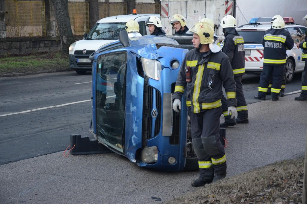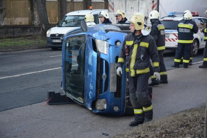 Am Montagmorgen kollidierten drei Autos auf der Gyömrői-Straße im X. Bezirk. Bei dem Unfall stürzte ein PKW auf die Seite und blieb so auf der Strasse liegen. Die Feuerwehr leitete die technische hilfeleistung ein. Die Fahrer der PKWs wurden leicht verletzt ins Krankenhaus gebracht. wie der PKW so spekatkulär auf die Seite gelegt werden konnte, untersucht jetzt die Polizei.