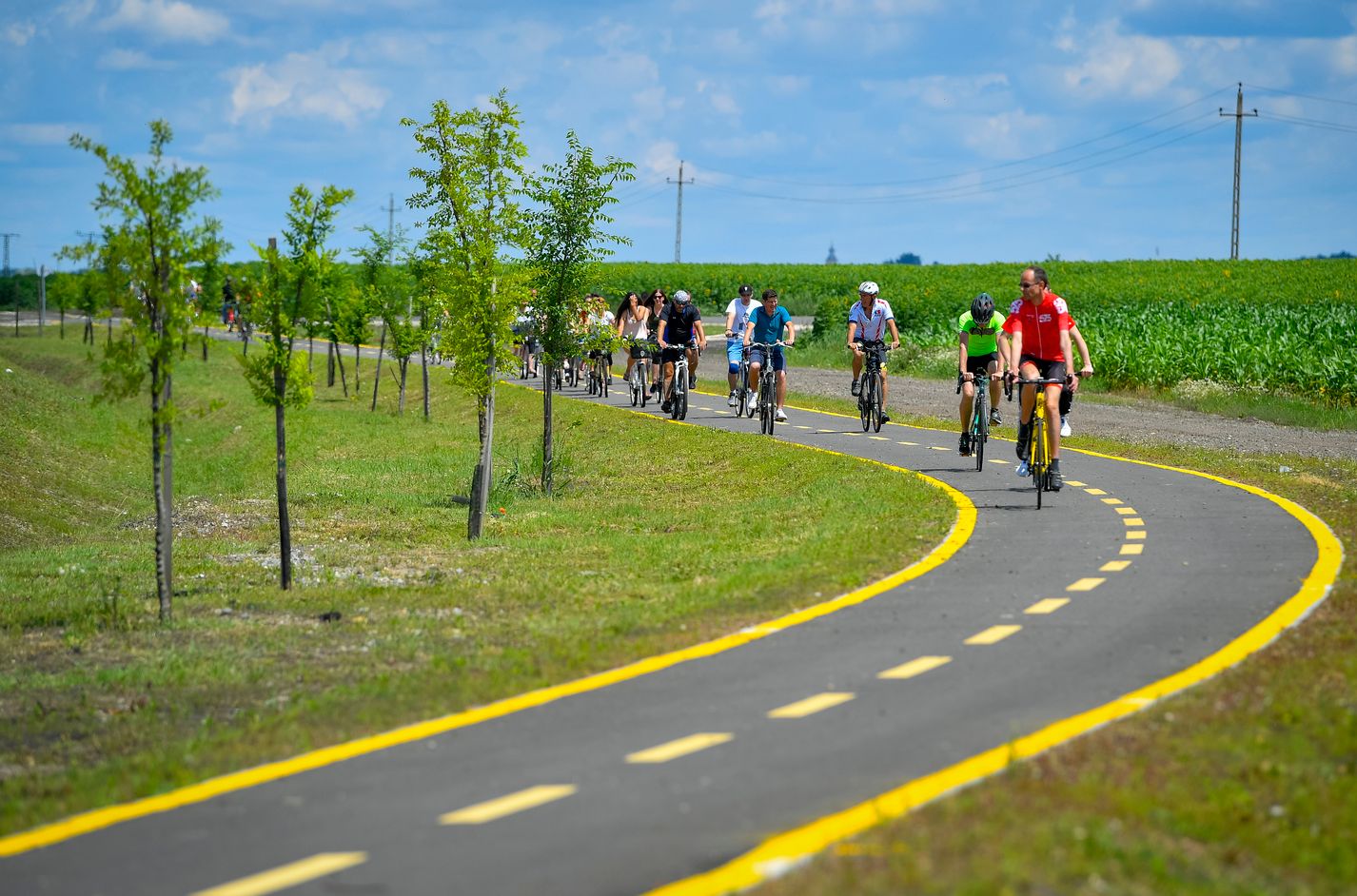 Wieder ein neuer Radweg in Ungarn. Die ersten Radfahrer sind bereits unterwegs auf dem Radweg zwischen Tépe und Berettyóújfalu, an der Kreuzung der M4 und der Hauptstraße Nr. 47 im Gebiet Berettyóújfalu, am Tag der Übergabe. Ungarns Radwegenetz entwickelt sich immer mehr zu einem sehr gut ausgebauten Netzwerk von hervorragend angelegten Radwegen.