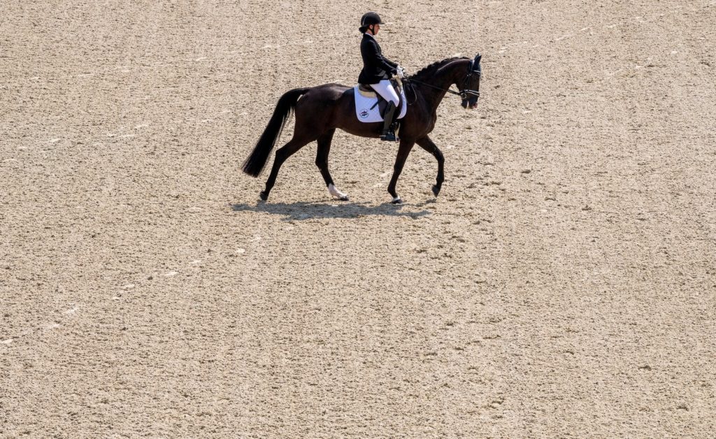Krisztina Kornis aus Ungarn tritt mit ihrer Primeval Shakira Stute beim 15. Einzel-Dressurwettbewerb der Maccabi European Games an der National Riding School an. Auch die Springreiter waren heute schon aktiv.