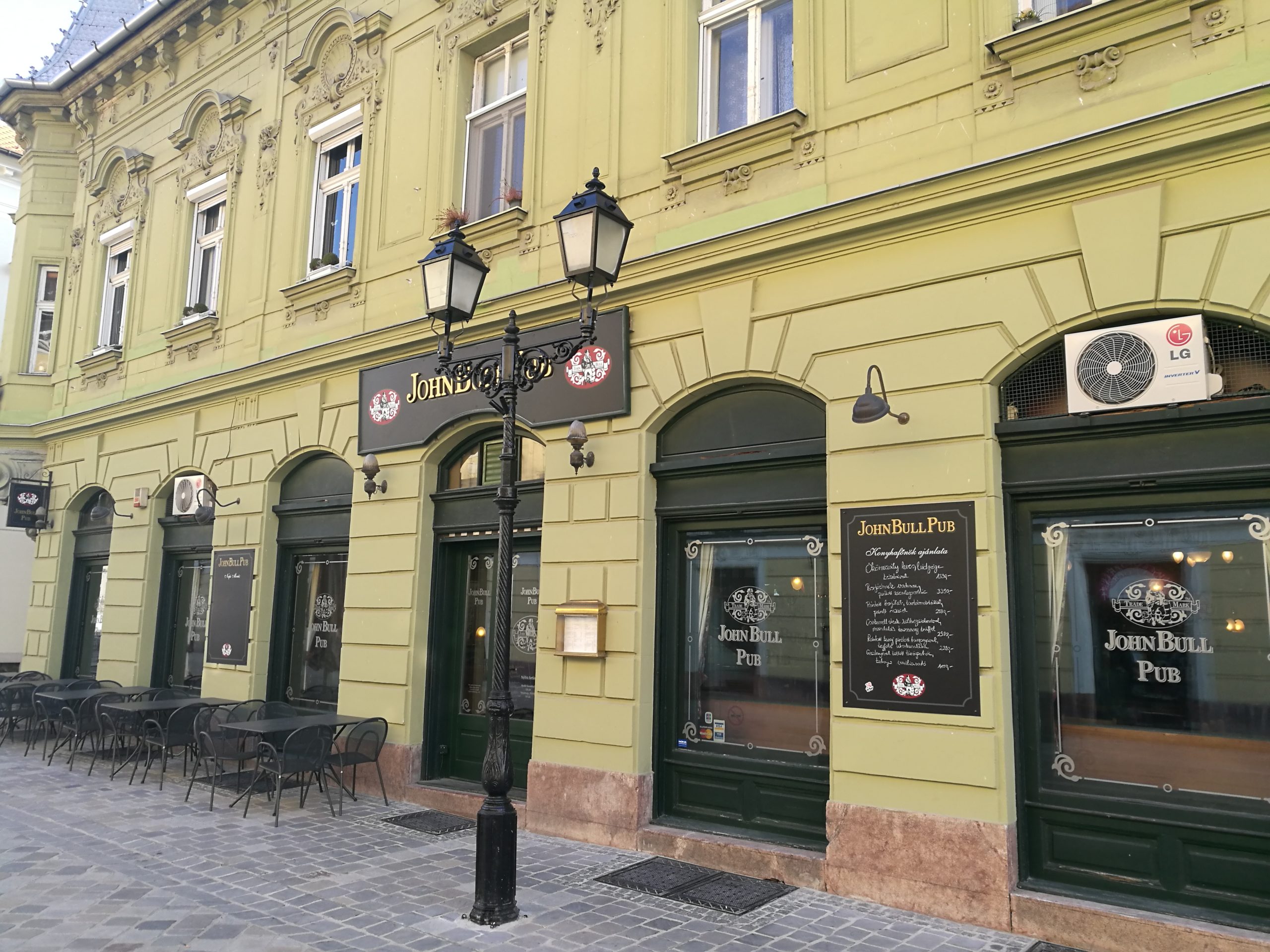 Ein imposantes grünliches Gebäude in einer der Gassen Györs. Hier befindet sich der John Bull Pub. Gemütlich eingerichtet mit sehr bequemen Sitzgelegenheiten vermittelt die Location sofort einen Hauch eines Irish Pub. Neben zahlreichen Biersorten kann man hier jedoch auch hervorragende Küche geniessen.