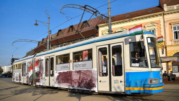 Die Helden der 56. Revolution und ihre früheren Fotografien schmücken die Straßenbahn. Die DKV Debreceni Transport Ltd. und das Debrecener Jugendhaus haben das Projekt gemeinsam ins Leben gerufen.