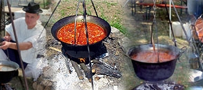 Das Paprikapulver sowie Kümmel, Majoran und Salz zugeben, mit der Fleischbrühe auffüllen und eine Stunde zugedeckt bei milder Hitze garen. Die Kartoffelwürfel, die Paprikastreifen und die Tomatenwürfel mit dem Knoblauch in die Suppe rühren und weitere