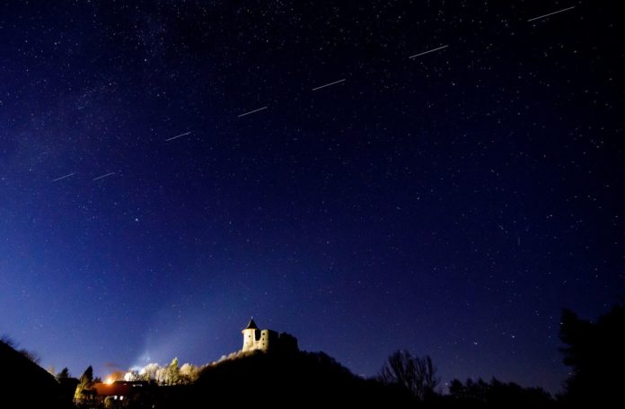 Am Himmel über der Burg von Somoskő sind Satelliten zu sehen, die am 28. Dezember 2019 in der Nähe von Salgótarján aufgenommen wurden. In der langen Belichtungszeit wird die Bewegung der Satelliten als heller Schnitt dargestellt. Jeder helle Abschnitt wurde separat von einem Satelliten erzeugt, der sich in seiner Umlaufbahn bewegt. US SpaceX plant die Einführung weiterer 60 Satelliten für die Einführung eines globalen Internetdienstes mit nicht-erdgebundener Oberflächeninfrastruktur.