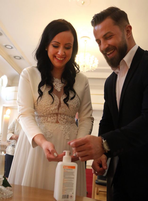 Tímea Jablonovszky und György Dávid Jablonovszky haben eine Hochzeit der besonderen Art vollzogen. Sie heirateten alleine nur im Beisein der Standesbeamten und der Trauzeugen. DAS alles in Zeiten von Corona.Natürlich musste auch der gesetzliche Mindestabstand eingehalten werden und während des ganzen Procedere mussten mehrmals die Hände und Umgebung desinfiziert werden. Eine eher unheimliche Stimmung und ziemlich trist. Auf den Kuss danach wollten die beiden jedoch nicht verzichten…