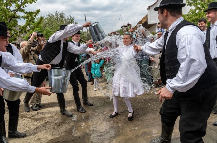 Auf diese Frau hat es das Lajta-Volkstanzensemble von Mosonmagyaróvár am Ostermontag besonders abgesehen. Im Freilichtmuseum von Szentendre hat man den Osterbrauchtum des „bewässerns“ von Frauen noch einmal richtig in Gang gesetzt und vorgeführt wie die richtige Bewässerung auszusehen hat. Für die Frau in dem Moment mit Sicherheit eine eiskalte Dusche. So geht Tradition in Ungarn. Schätzen wir mal, es war wohl eine der am heftigsten bewässerten Frauen gestern an Ostern.