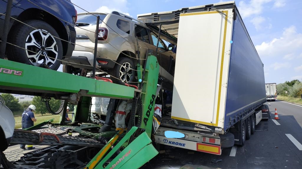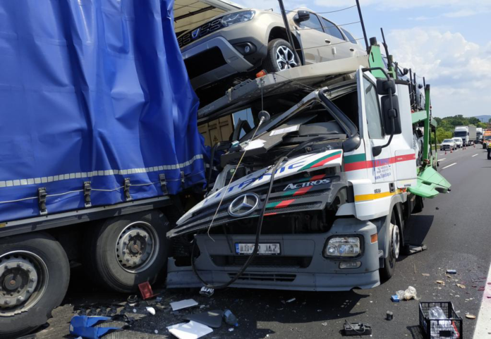 Am Mittwochmorgen kollidierten drei Lastwagen auf der Autobahn M1 in der Nähe von Biatorbágy. Durch den Unfall kam es zu erheblichen verkehrsbehinderungen. Die Feuerwehr aus Törökbálint mussten einen der Fahrer aus dem Fahrzeug befreien. Ein Autotransporter war regelrecht in einen Auflieger gefahren und dort verkeilt. Während der technischen Bergung kam es auf dem betroffenen Straßenabschnitt zu Stau. Der Fahrer des Autotransporters wurde schwerverletzt.