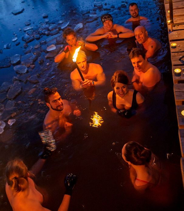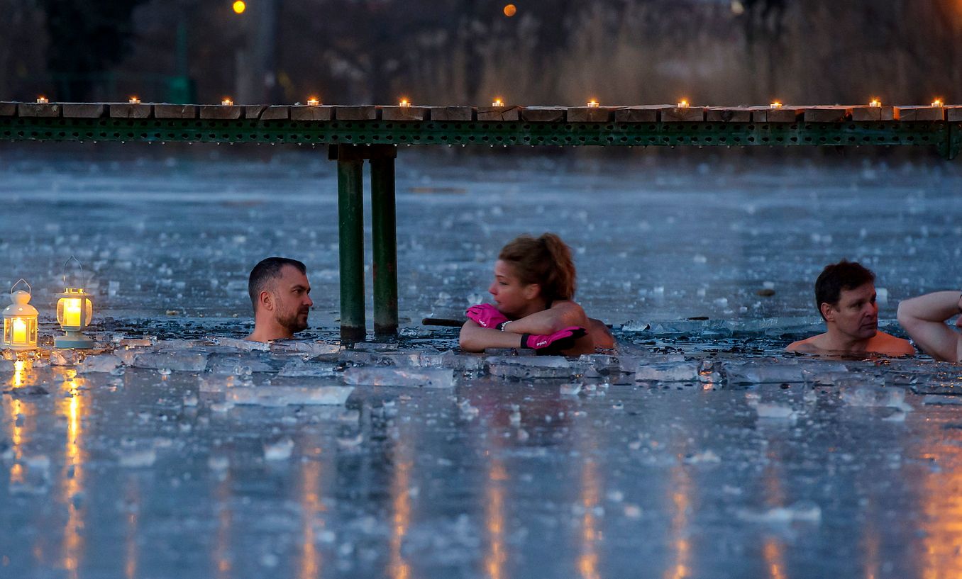 Diese Gruppe von Badegästen hat starke Nerven. Einmal pro Woche trifft man sich zum Kaltwasserbaden im Veresegyházi-See. Im Winter ist der badespass für die Gruppe zum Kult geworden und sie tauchen im gemütlichen Ambiente in das frostige Wasser ein. Derzeit müssen sie dei entsprechende Stelle erst jedoch vom Eis befreien. Mit ein paar Kerzen drumherum sieht das ganze doch richtig romantisch aus…wenn da nur nicht die Temperaturen wären…Ganz schön „coole“ Angelegenheit.