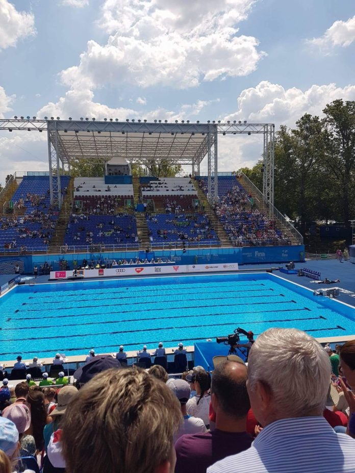 Soeben sind im Városliget wieder die Disziplinen im Synchronschwimmen gestartet. Vor wunderschöner Kulisse und traumhaftem Wetter sind die Teilnehmer in den Wettbewerb gestartet. Gestern konnte Swetlana Kolesnitschenko (Russland) den ersten Titel im Synchronschwimmen holen. Die Berlinerin Michelle Zimmer hatte als 17. das Finale verpasst.