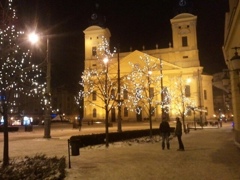 Auf dem Weihnachtsmarkt vor dem „Debrecener Dom“ strahlen Bäume, Lichtmasten und der Budenzauber in vielen Tausend Lichtern.