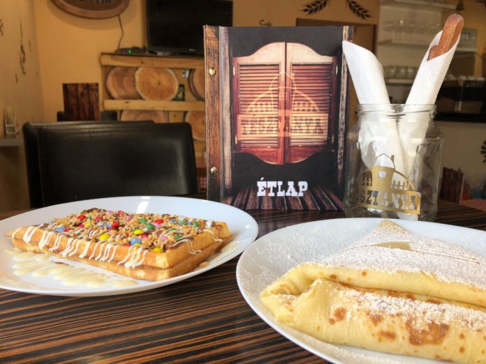 Waffeln, Pfannkuchen und Shakes im Umfeld von Westernstyle im ungarischen Györ…Eine coole Kombination im TESZTANYA mitten in der Innenstadt. In diesem saloonähnlichen Restaurant kann man die süßesten Verführungen in Waffel- Pfannkuchen- oder Shakeform geniessen. Auch wer es salzig mag kommt auf seine Kosten, denn für richtige Cowboys gibt´s das ganze natürlich auch deftig. Eine schöne, abwechslungsreiche Idee mitten in der westungarischen Stadt Györ.