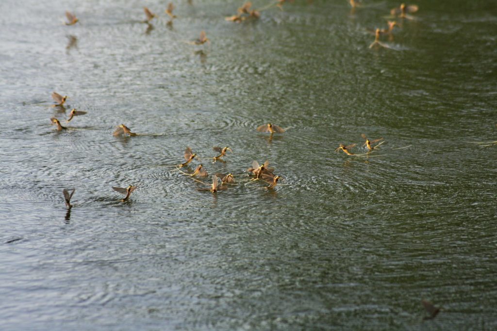 Das spektakuläre Auftreten der Köcherfliegen hängt vom Wetter, der Wassertemperatur, der Luftfeuchtigkeit und der Windrichtung ab. Einige Vermutungen besagen, dass auch die Position des Mondes entscheidend ist. Aufgrund der ungewöhnlichen Wetterbedingungen dieses Jahres erlebten wir bereits im Februar frühlingshafte Temperaturen, sodass nicht nur die Bäume früher blühten, sondern auch einige vereinzelte Köcherfliegen bereits im April mit ihrem Paarungstanz begannen.