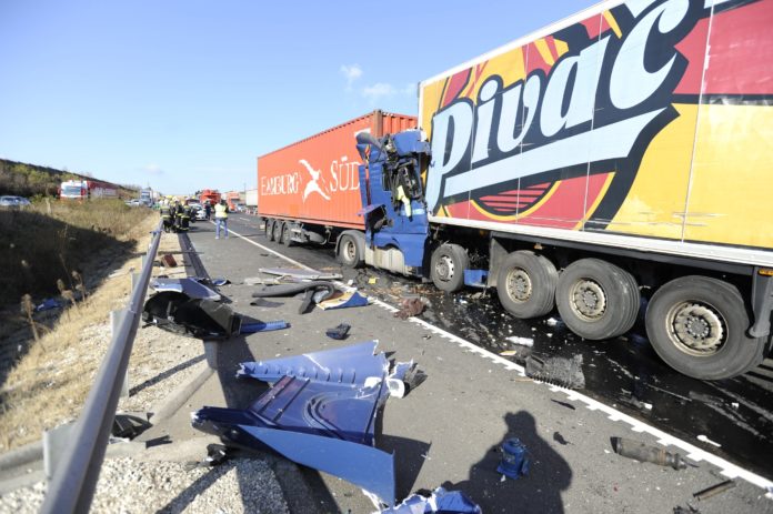 Három kamion ütközött össze, vélhetően ráfutásos baleset történt. Az egyik jármű annyira összeroncsolódott, hogy vezetője a fülkébe szorult, ő a helyszínen meghalt.