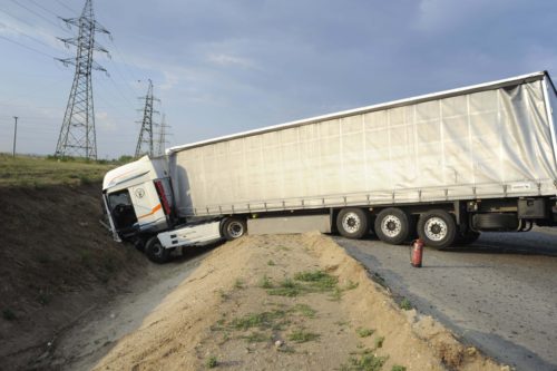 Kamion az árokban az M2-es autóútnál Dunakeszi közelében, miután személygépkocsival ütközött 2018. augusztus 21-én. A balesetben a személyautó vezetõje meghalt.