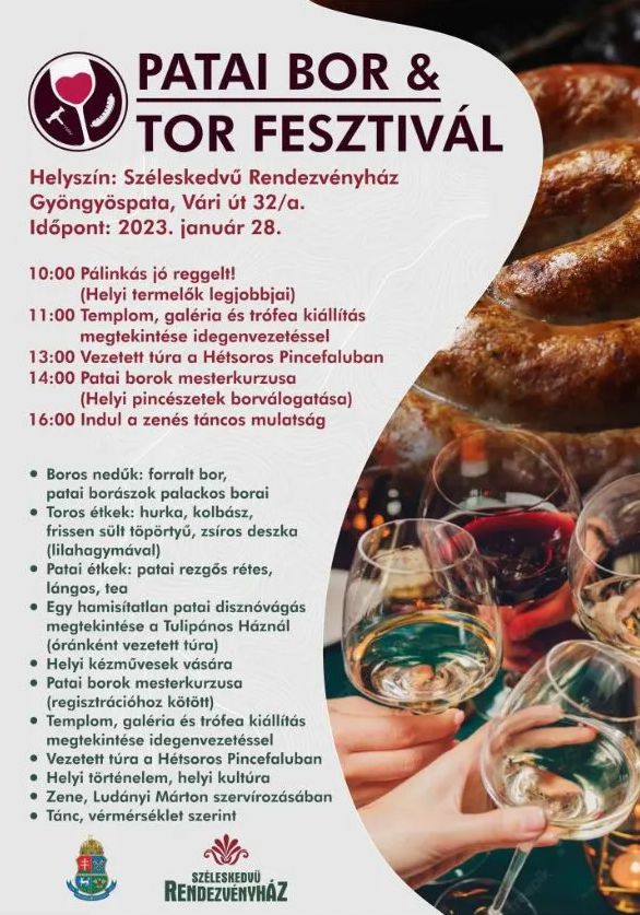 28. Januar, Samstag Patai Wein- und Schlachtfest 2023 Gyönygöspata (12 km von Gyönygyös, Komitat Heves)Neben der Handwerksmesse lokaler Erzeuger können die Besucher einen Einblick in das Weinsortiment lokaler Weinkellereien gewinnen, typische Gerichte probieren und einer authentischen Patai-Schweineschlachtung beiwohnen. Die Besucher können auch an Führungen und Ausstellungen teilnehmen. Dies ist eine perfekte traditionell ungarische Veranstaltung für das Wochenende!