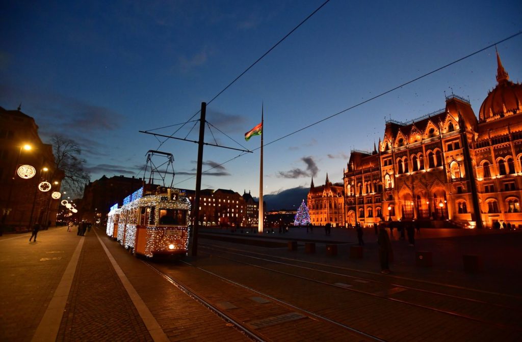 Die Weihnachtstram vor dem Parlament / Foto: MTI/Mónus Márton