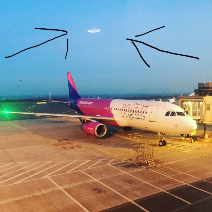 Dieses spannende Foto haben wir am Flughafen Dortmund aufgenommen. Im Nachhinein erkennen wir ein merkwürdiges Objekt über der Wizzair Maschine die gerade in Richtung Budapest fliegen soll.