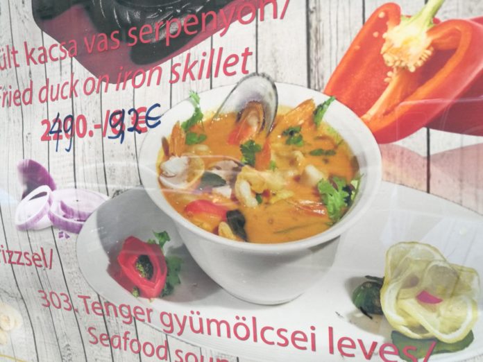 Diese Preiserhöhung in einem Restaurant in Budapest auf der Aussenwerbung wurde ganz dezent vollzogen… Etwas zum Schmunzeln und vielleicht hat man trotz des erhöhten Preises noch hunger auf ein leckeres Mittagessen aus der ungarischen Küche…