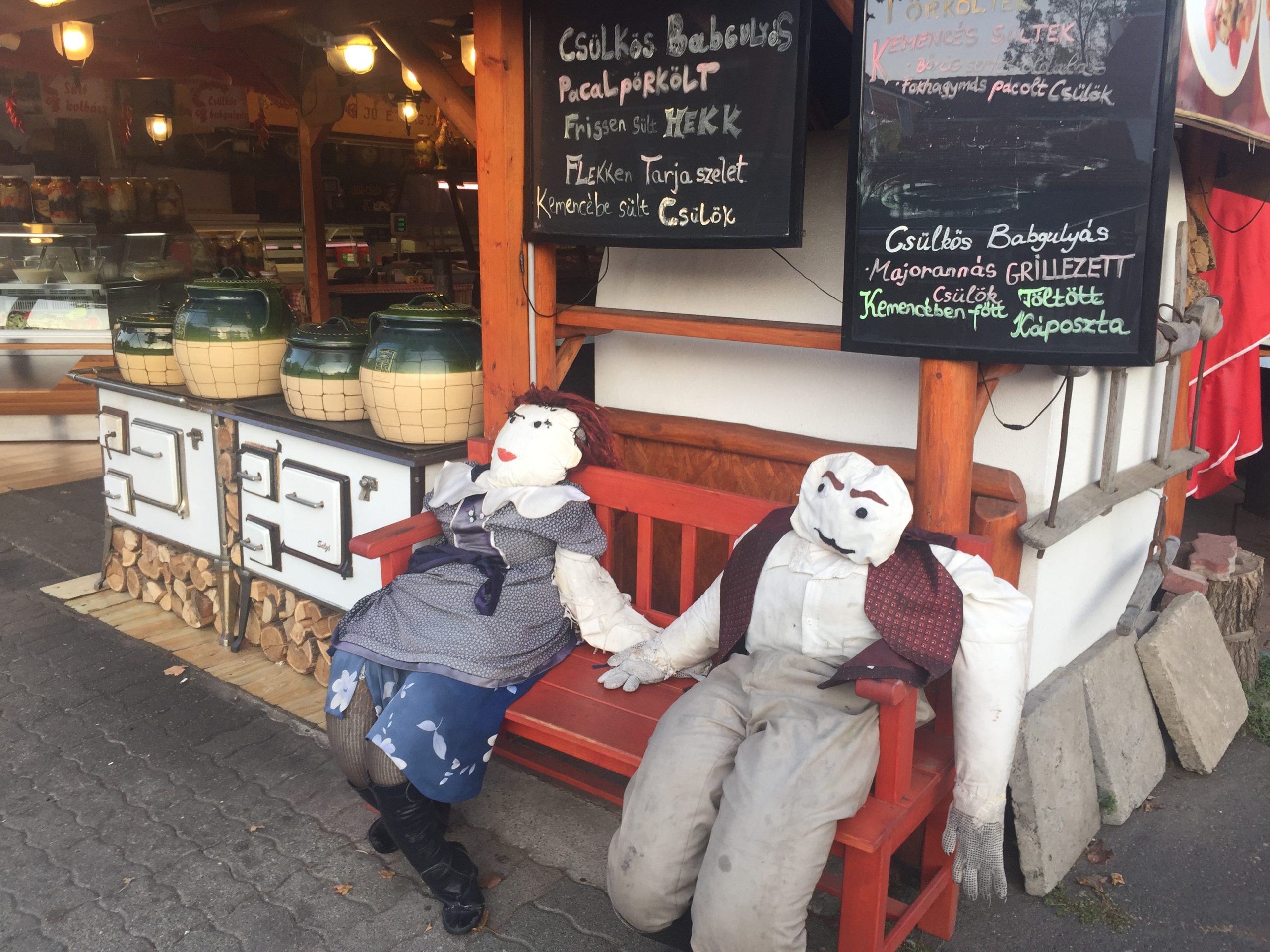 Diese zwei Figuren symbolisieren wohl die gelassene Lebenseinstellung der Ungarn auf dem Lande und die Freude auf das gute gutbürgerliche Essen. Gesehen haben wir dies in Hajduszoboszlo. Es passt einfach, oder?