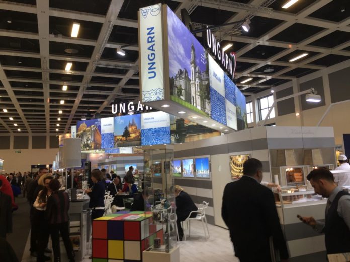 Mit einem großen Messestand präsentiert sich Ungarn auf der ITB. An verschiedenen Punkten können die Messebesucher sich kulinarisch erfreuen lassen,so gibt es Wein und Palinkaproben, Wurstspezialitäten oder aber der beliebte Kürtöskalacz (Baumkuchenart).