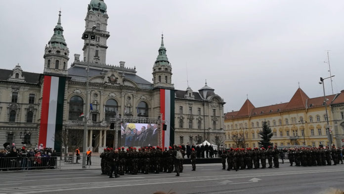 Die Nationalhymne Ungarns zu Beginn der Parade vor dem Rathaus in Györ: