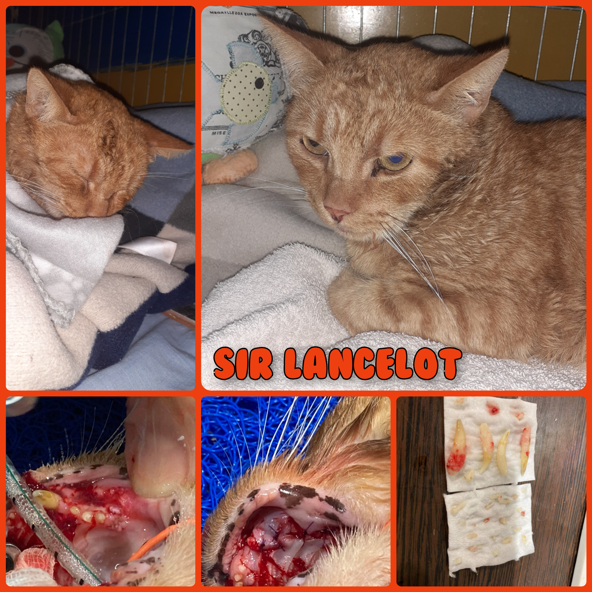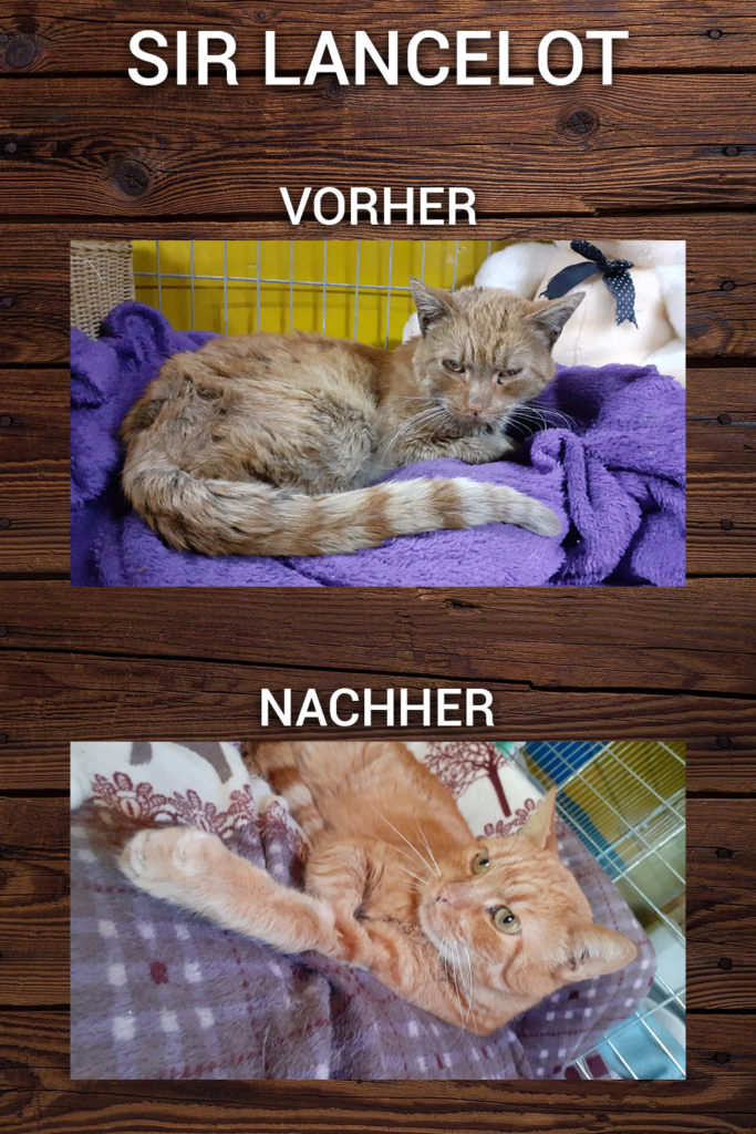 „Sir Lancelot kam letzten November in einem schrecklichen Zustand zu uns. Er lebte sein tägliches Leben bei einem Unternehmen, wo er gefüttert wurde. Eine echte Wildkatze, es hat lange gedauert, ihn zu fangen. Er ist ein 3 Jahre alter Kater und wog bei seiner Ankunft 1,8 kg. Zu uns kam er schmutzig, mit Geschwüren im Mund, entzündeten Sehnen, stinkendem Mund, faulenden Zähnen. Er wurde negativ auf FIV/FeLV getestet. Nach einer mehrwöchigen Behandlung wurde er operiert, dann wurden einige Zähne entfernt, es dauerte lange, bis er geheilt war. Nach der ersten Operation ließen wir ihn aus dem Käfig, fütterten ihn, bis er schließlich ein gesundes Gewicht von 4 kg erreichte, er ist ein wunderschönes Kätzchen geworden. Im April wurde er zum zweiten Mal operiert und alle Zähne wurden entfernt. Sein vorübergehendes Frauchen hat 4 Monate gebraucht, um Vertrauen zu Sir Lancelot aufzubauen und ihn streicheln zu können, er lässt niemand anderen an sich heran. Bis jetzt haben wir 276.500 HUF (ca. 730€) für seine Behandlungen ausgegeben (das beinhaltet nicht sein Futter, das „speziell“ ist, weil er nur 2-3 Sorten Fischfutter frisst – er ist wählerisch). Trotz der Tatsache, dass er keine Zähne hat, kann er gut essen, sogar Trockenfutter! Trotz allem lieben wir ihn und tun alles für ihn. Nachdem er komplett geheilt ist bekommt er auch seine Impfungen.“
