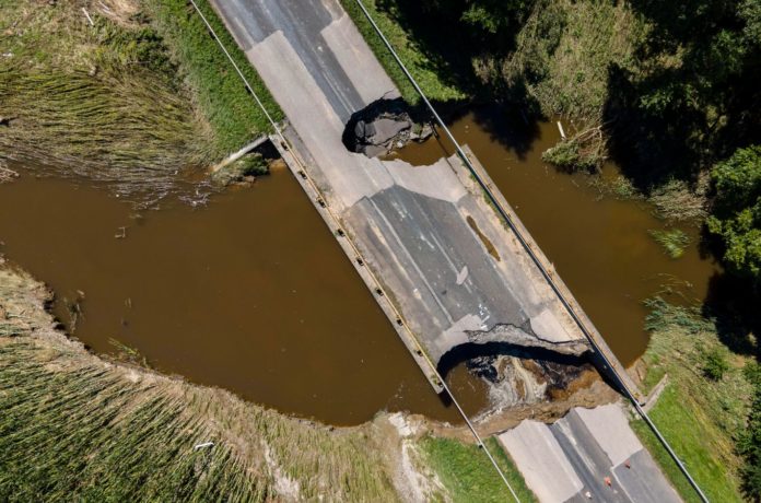 Auf dem Bild zu sehen, die zerstörte Brücke des Rinya-Baches. Die Brücke auf dem Abschnitt der Hauptstraße 68 zwischen Böhönye und Segesd durch die starken Fluten zerstört.