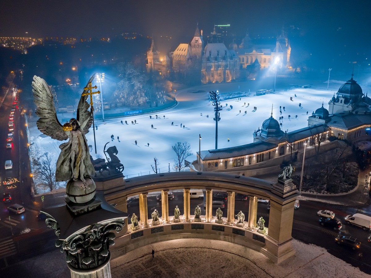 Die Eislaufbahn in Budapest belegt den zweiten Platz in Europa und bietet eine atemberaubende Aussicht auf die Vajdahunyad-Burg.