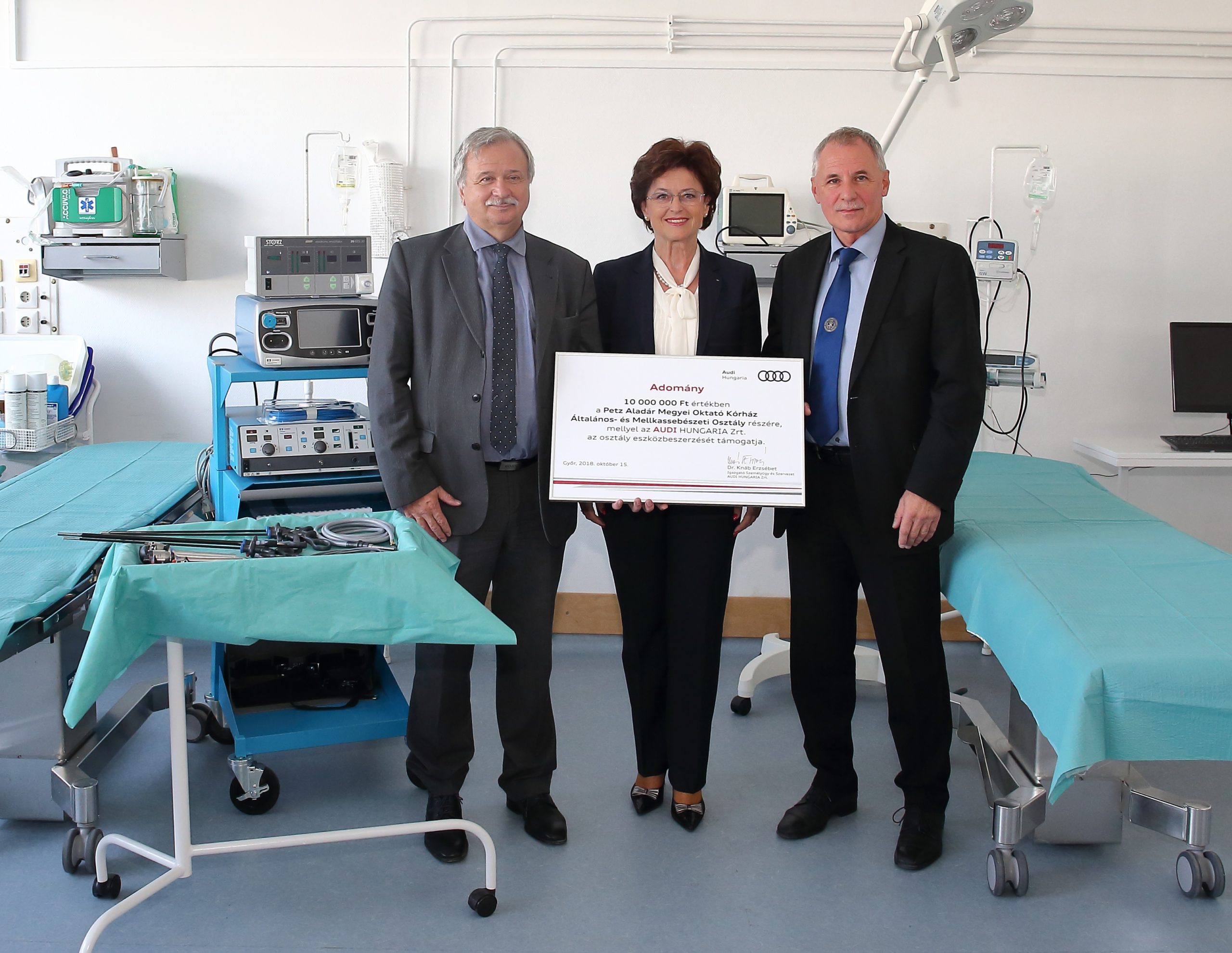 Mit der Unterstützung von Audi in der Höhe von 10 Millionen Forint beschaffte das Krankenhaus unter anderem medizinische Instrumente und ein spezielles Lasergerät, die bei modernen chirurgischen Behandlungen wie etwa laparoskopischen Operationen unverzichtbar sind. Mit den Geräten, die speziell für die laparoskopische Chirurgie entwickelt wurden, leistete Audi Hungaria einen Beitrag zu einer effektiver funktionierenden Abteilung für Allgemein- und Thoraxchirurgie.
