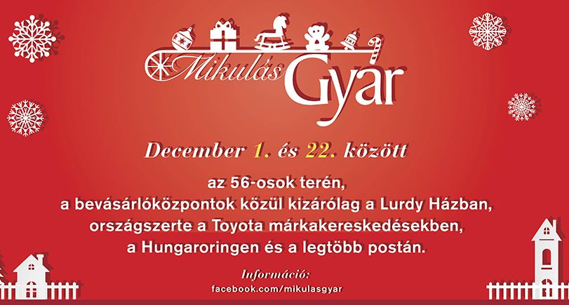 Daneben können die Spenden im Einkaufszentrum Lurdy Ház (Könyves Kálmán krt. 12-14, täglich von 10 bis 19 Uhr), landesweit bei Toyota Fachhändlern und am Hungaroring abgegeben werden. Zudem nimmt fast jede ungarische Poststelle Spenden entgegen, die dann dem Ungarischen Roten Kreuz übergeben werden. Ein Verpacken als Paket ist nicht notwendig. Wichtig ist nur, dass man mit großen Buchstaben „MIKULÁSGYÁR“ draufschreibt.