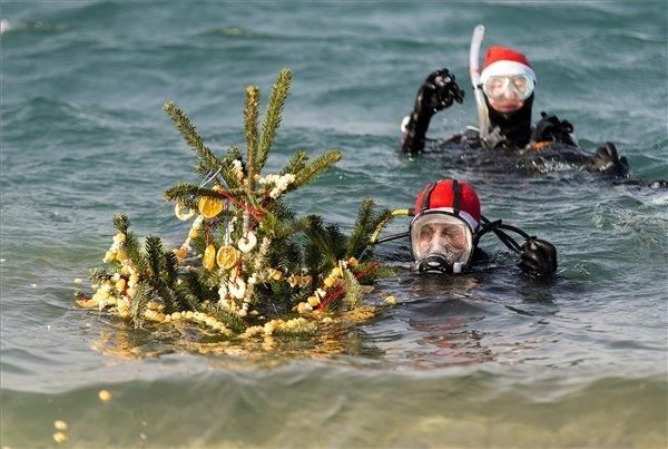 Bei Hegyeshalom haben ungarische und österreichische Taucher zu einem „Weihnachtstauchen” zusammengefunden – und der Tradition entsprechend einen Weihnachtsbaum unter Wasser geschmückt. Und das bei Temperaturen knapp über dem Gefrierpunkt… .