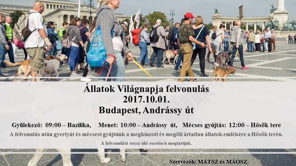 Der Ungarische Tierschutzverband organisiert dieses Jahr einen Zug für die Tiere – alle können beliebige Tiere mitnehmen (die an einer Leine geführt werden können). Der Zug findet am Sonntag, den 1. Oktober ab 9 Uhr statt. Der Treffpunkt ist die St.-Stephans-Basilika (Szent István Bazilika) auf dem St.-Stephans-Platz (Szent István tér).