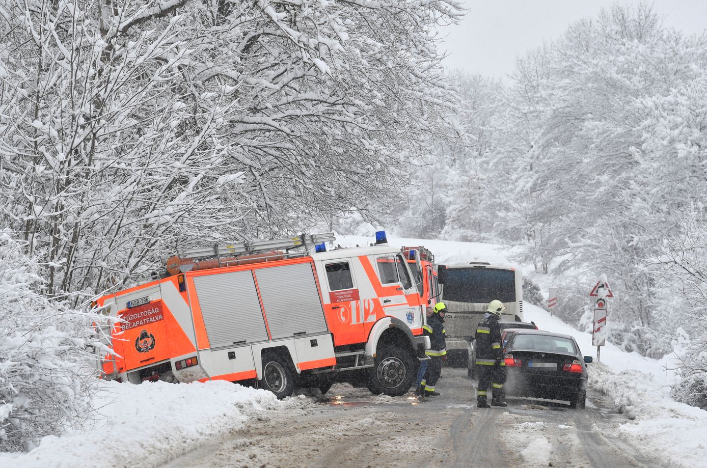 Zahlreiche Unfälle auf glatten Strassen wie hier in Szilvásvárad wo eine Feuerwehrfahrzeug auf dem Weg zum Einsatz von der Fahrbahn rutschte. Verletzt wurde hier glücklicherweise niemand. Im Norden Ungarns solrgen derzeit Schnee und Eis für glatte Strassen. Im Komitat Heves sind die Einsatzkräfte pausenlos im Einsatz.