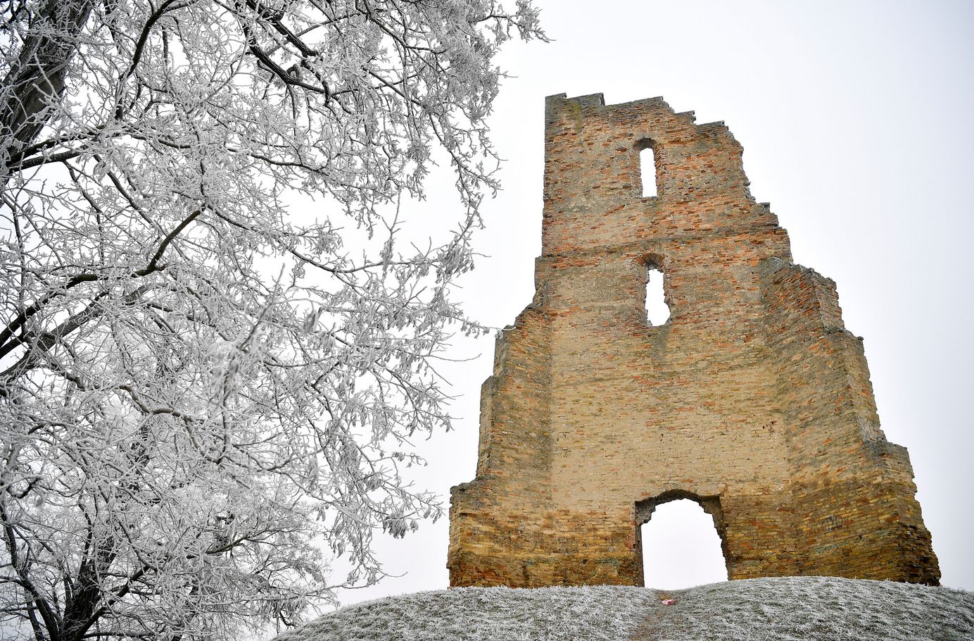 Eine wunderschöne Winterstimmung der Ruinen der Kirche des ehemaligen Dorfes Zelemér unter schneebedeckten, vereisten Bäumen, in der Nähe von Hajdúböszörmény.