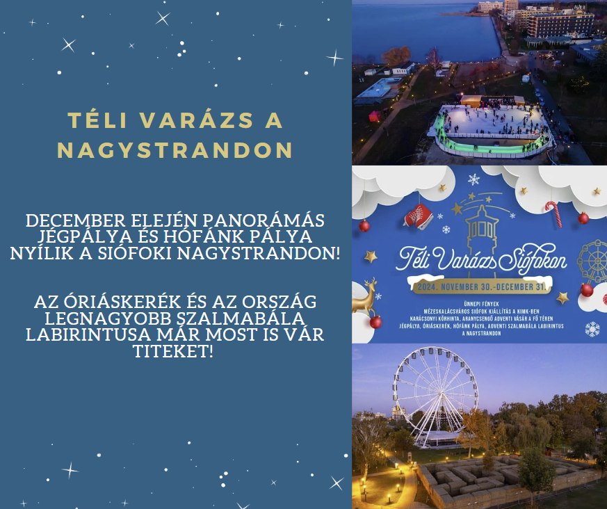 Besinnliche Weihnachtsbeleuchtung, Konzerte zur Einstimmung auf die Feiertage, ein Weihnachtskarussell, heiße Winterspezialitäten, bezaubernde Kinderprogramme und eine zauberhafte Atmosphäre erwarten die Besucher rund um den Wasserturm auf dem Hauptplatz der Stadt bereits ab dem 29. November. Anfang Dezember eröffnet am großen Strand von Siófok eine Panorama-Eisbahn und eine Schneereifenbahn. Zusammen mit dem größten Strohballen-Labyrinth des Landes und dem Riesenrad bietet Siófok bis Februar ein perfektes Ziel für Winterliebhaber.