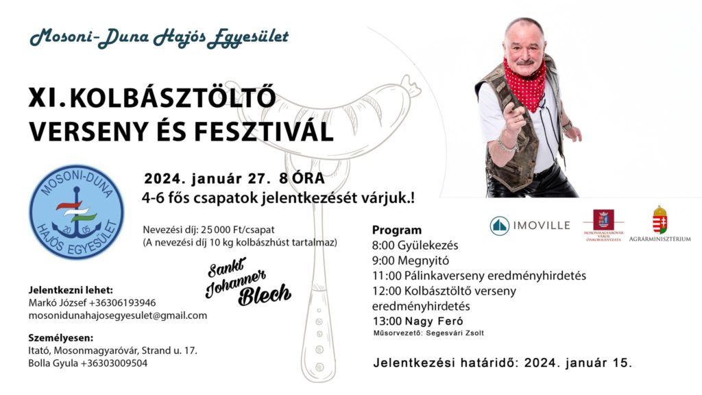 Am 27. Januar lädt Mosonmagyaróvár bereits zum elften Mal zum Kolbászfüllwettbewerb und Festival ein. Der Eintritt zu der Veranstaltung ist kostenlos. Besucher können sich auf köstliche Speisen, Getränke und Konzerte freuen.