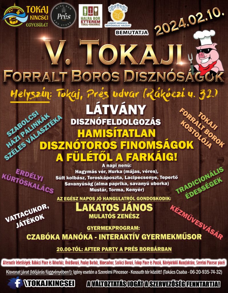 Am 10. Februar wird zum fünften Mal das Event „Tokaji Forralt Boros Disznóságok“ veranstaltet. Ab 8 Uhr morgens erwartet die Besucher eine spektakuläre Schweineschlacht, traditionelle Schlachtfestspezialitäten, besondere Glühweine, Wettbewerbe, Kinderprogramme, gute Laune und gute Musik.