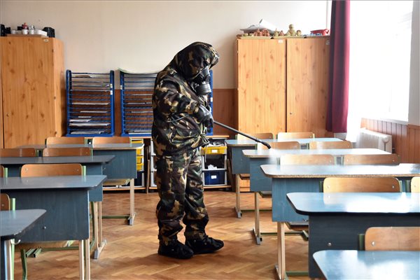 Zahlreiche Schulen in Ungarn, wie auch hier eine Grundschule in Szolnok werden derzeit von Soldaten desinfiziert. In Szolnok wurde das Coronavirus bei mehreren Lehrern und Schülern festgestellt. Oberst Szabolcs Pécsvárady, beauftragter Brigadekommandeur, sagte: Neun Soldaten desinfizieren die Einrichtung mit einer alkoholreichen Substanz.