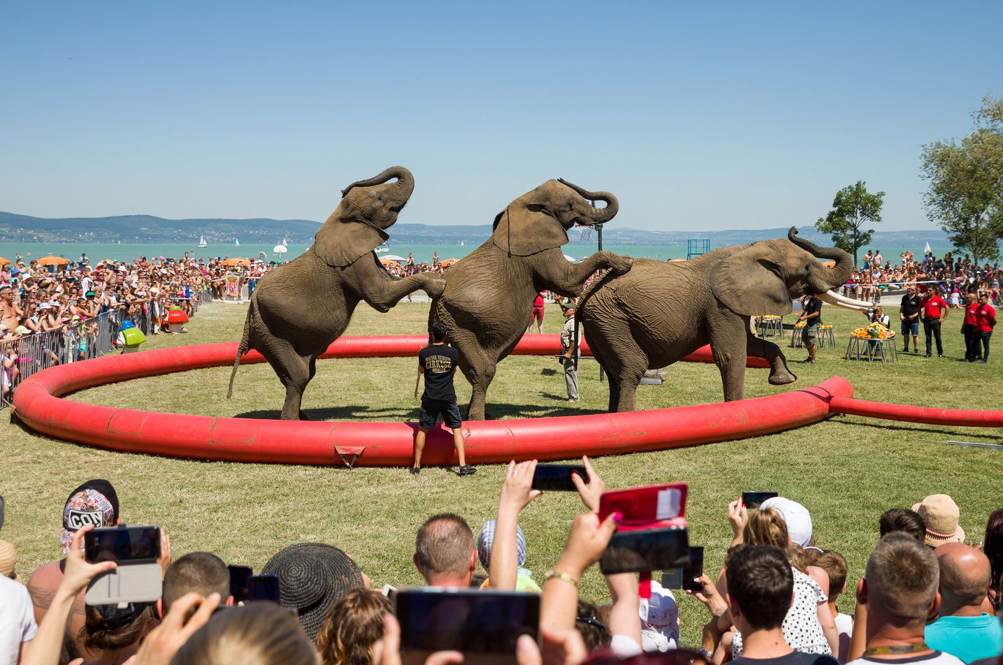 Die Elefanten des ungarischen Nationalzirkus sind am Wochenende wieder einmal traditionell am Balaton baden gegangen. In Balatonlelle gastiert der Zirkus derzeit und hat zu Werbezwecken die Elefanten publikumswirksam bis zum Seeufer gebracht wo sie nach einer kurzen Showeinlage ins Wasser zum baden durften.