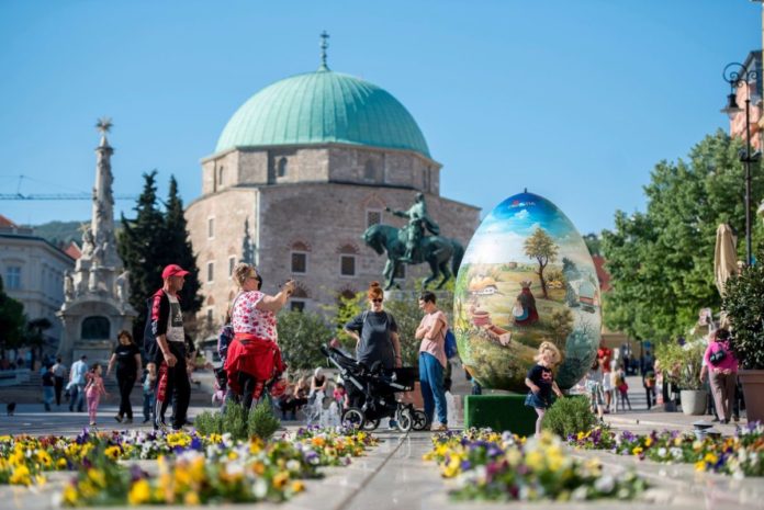 Besucher die heute auf dem Szécheny-Platz in Pécs das Osterwetter geniessen, werden auch auf das „Riesen-Ei“ stossen. Mitten auf dem Platz hat man ein kunstvoll gestaltetes Osterei mit einer Größe von zwei Metern platziert. Künstler aus einer kroatischen Stadt haben das Ei entworfen. Imposant und mit Sicherheit an Ostern eines der beliebtesten Selfie-Motive in der Stadt.